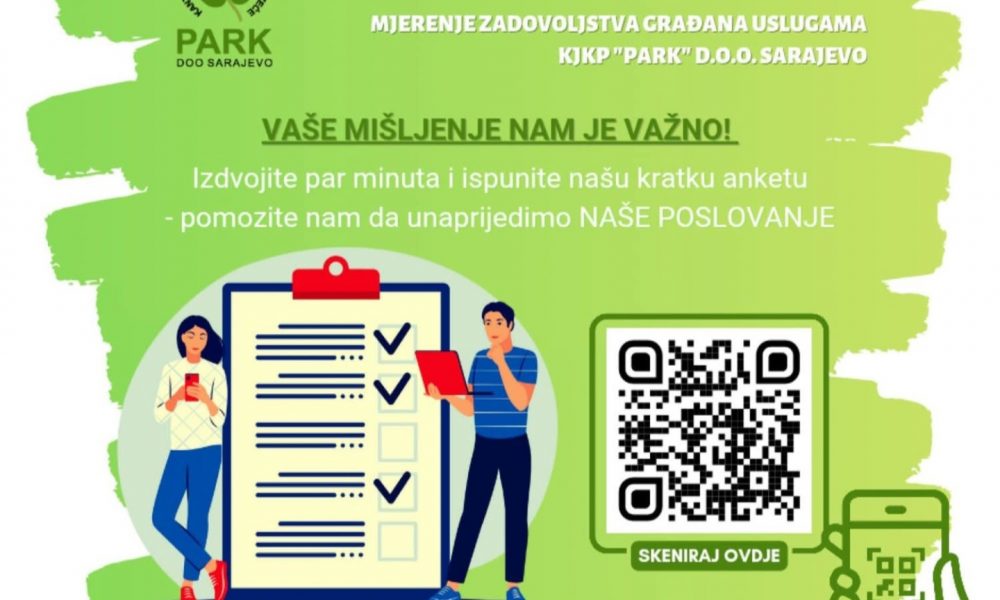 Poštovani sugrađani, korisnici naših usluga, KJKP”Park”d.o.o. Sarajevo nastavlja anketiranje i u posljednjoj trećini ove poslovne godine, jer Vaš stav i mišljenje o uslugama koje pružamo su nam izuzetno važni kako bi unaprijedili kvaliteta usluga koje pružamo u održavanju javnih zelenih površina u KS. U sedam općina KJKP”Park”d.o.o.Sarajevo na održavanje je povjereno 42,5% od ukupnog broja